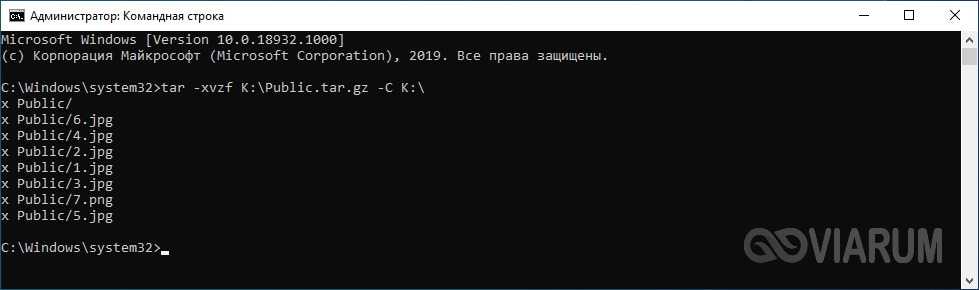 Путь указываем полный и без скобок. Архив будет распакован в указанное расположение, а список содержащихся в нем файлов отобразится в консоли. Приведенный здесь способ, однако, работает не во всех версиях «десятки», а только в сборках начиная с Windows 10 1809 и далее.