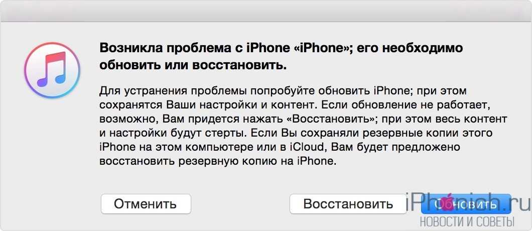 Шаг 2. Если программа iTunes автоматически не открылась, открой ее. Сразу должно появится предложение обновить или восстановить iPhone.