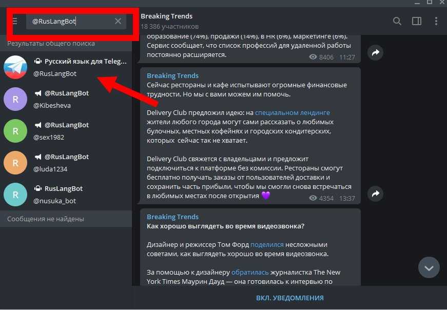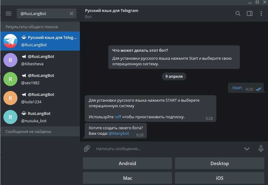 Есть и другой чат-бот, с помощью которого можно перевести приложение на русский язык – @RusLangBot. Как и с роботом Антоном, сначала нужно ввести имя бота в поиск.