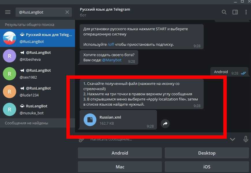 Существует еще один способ, как поменять язык в Телеграмме на Айфоне, Андроиде или ПК. Для этих целей используйте один из ботов. Как вариант — @RusLangBot. Алгоритм действий имеет такой вид: