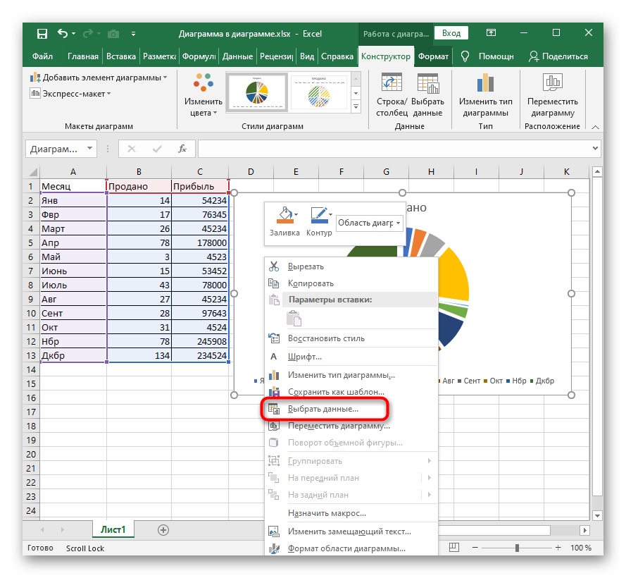 Если в дальнейшем возникнет необходимость изменить данные используемые для построения диаграммы, то для этого нужно выделить диаграмму, перейти на вкладку «Конструктор» и нажать на кнопку «Изменить данные» .
