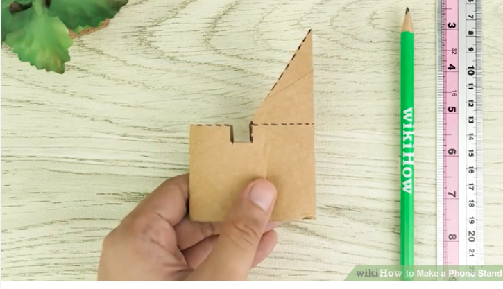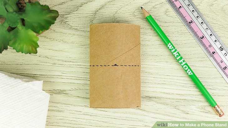 Взятую полоску складывают в виде треугольника, делают надрез (чтобы получился выступ для смартфона) и фиксируют конструкцию при помощи кнопок, клея или скотча.