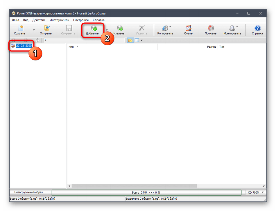 Теперь слева вы увидите новый созданный проект, который следует выделить, нажав по нему один раз левой кнопкой мыши. Затем кликните по «Добавить», которая расположилась на верхней панели PowerISO.