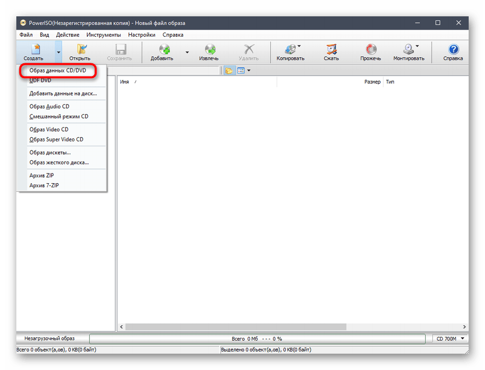Откроется список с дополнительными опциями, где следует выбрать «Образ данных CD/DVD».