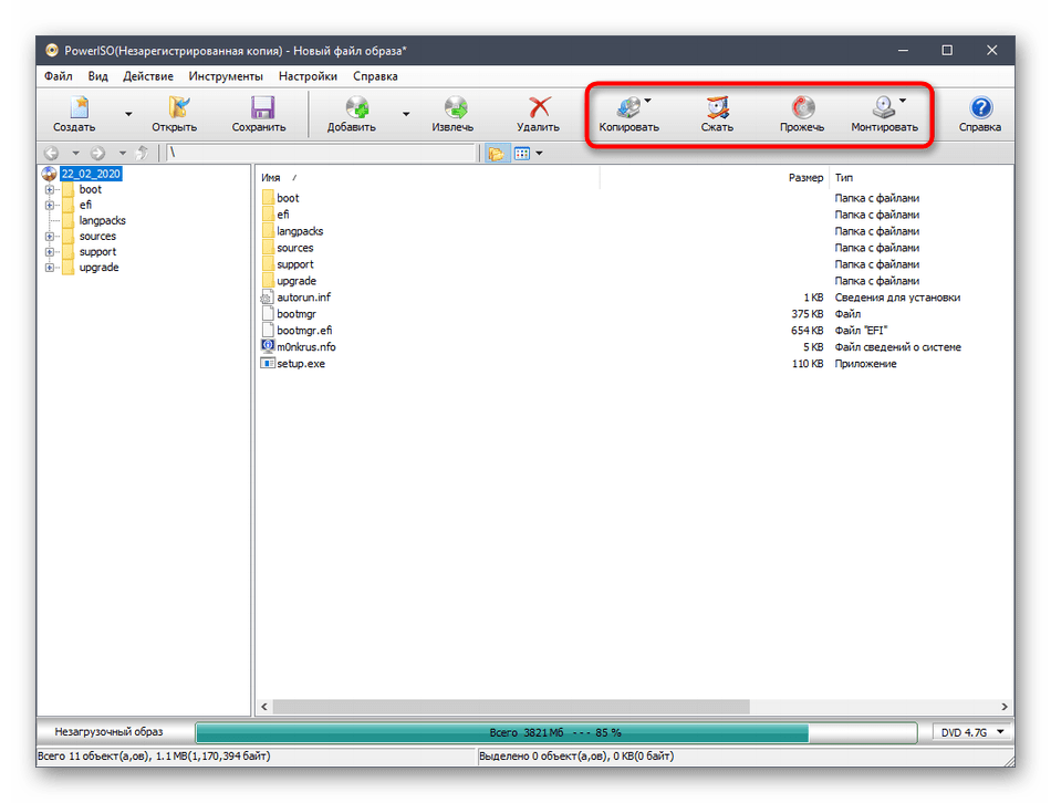 Если требуется выполнить дополнительные действия, например, сразу же смонтировать файлы, скопировать их на диск, сжать или прожечь накопитель, обратите внимание на четыре специально отведенные кнопки. Они отвечают за все эти опции в PowerISO