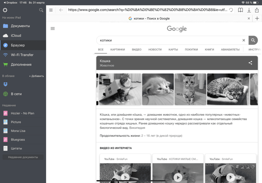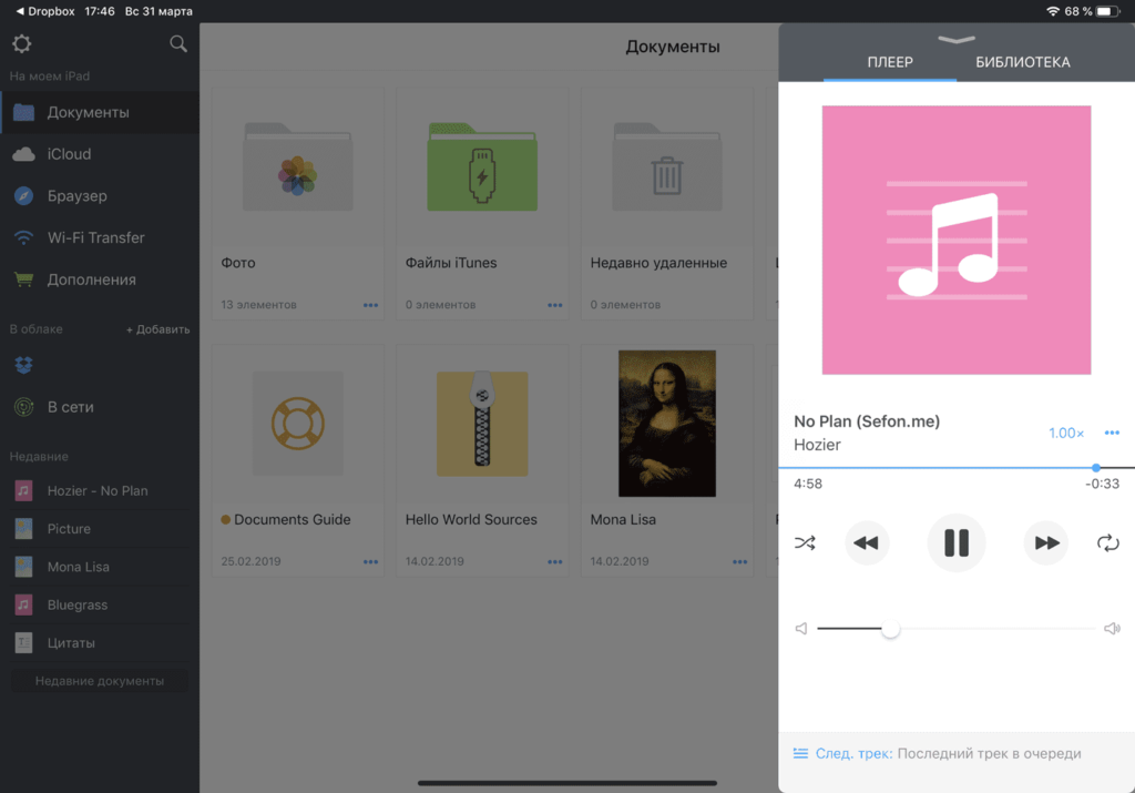 Стоит отметить, что внутри приложения есть внутренний браузер, через который вы можете загружать в Documents как музыку, так и прочие файлы. Разумеется, их не обязательно хранить в «облаке». Вы без проблем можете скачать их в память устройства и просматривать в любое время. В целом можно сказать, что данная программа не столько для музыки, сколько в общем для работы с файлами. Но уж если используете ее и при этом возникает проблема с передачей музыкальных файлов на устройство, то осуществляйте эти действия через Documents.