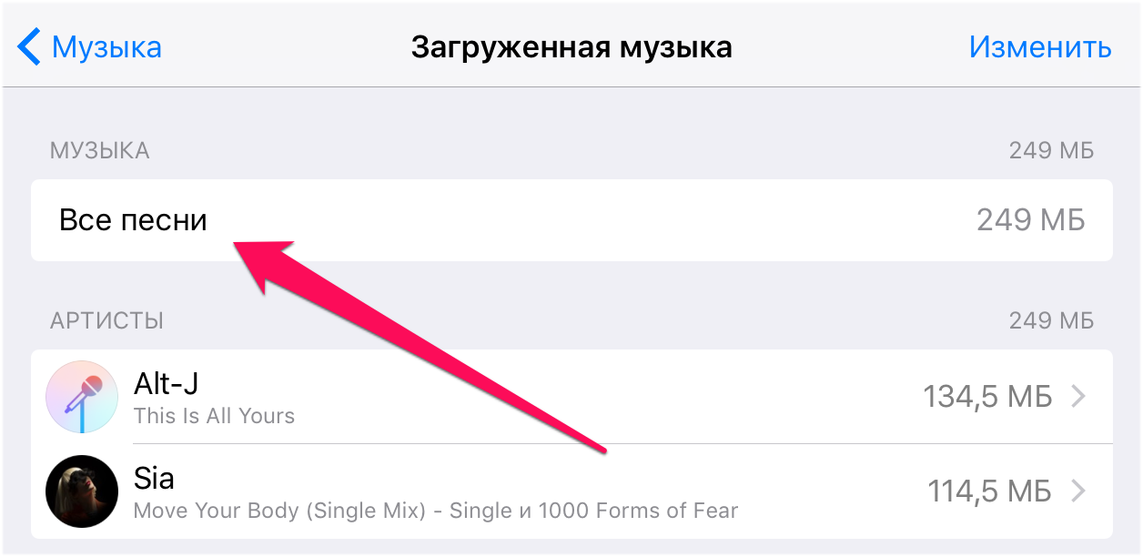 Шаг 3. Нажмите «Изменить» и удалите исполнителей, музыка которых на устройстве вам более не нужна. Отметим, что удалить можно и конкретный альбом или даже песню. Для этого требуется выбрать исполнителя и уже на открывшейся странице нажать «Изменить».