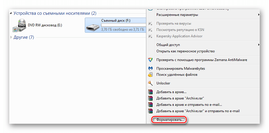 - В «Компьютере» кликните правой кнопкой по USB-накопителю и выберите пункт «Форматировать».