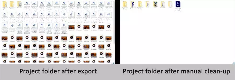 If you want to keep a tidy project, create three folders, and name them Audio, Video, and Images. Then cut and paste or drag and drop the assets in the appropriate folders. The only remaining files should be any LUTs and the .prproj or Premiere Pro project file. Below you can see a before and after shot of the exported project folder. If your project included many media files, you can see that a manual clean-up will make it easier to work with the project if you meed to make a revision in the future.