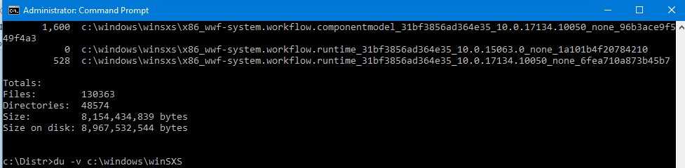 Но проще всего проанализировать размер хранилища компонентов в папке WinSxS с помощью команды DISM: