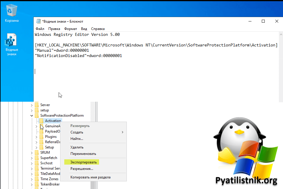 Получить его можно из любого текстового файла со сменой расширения или же можно просто экспортировать готовые настройки в нужный файл, тут вы сами смотрите как вам удобно. Главное, что данный метод на 100% отключает на экране надпись об активации Windows.