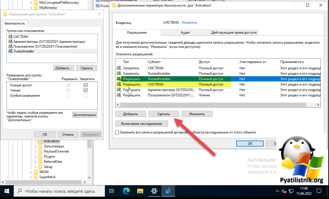 Удалите две разрешающие записи для «СИСТЕМА» и «TrustedInstaller», должны остаться только запрещающие записи.
