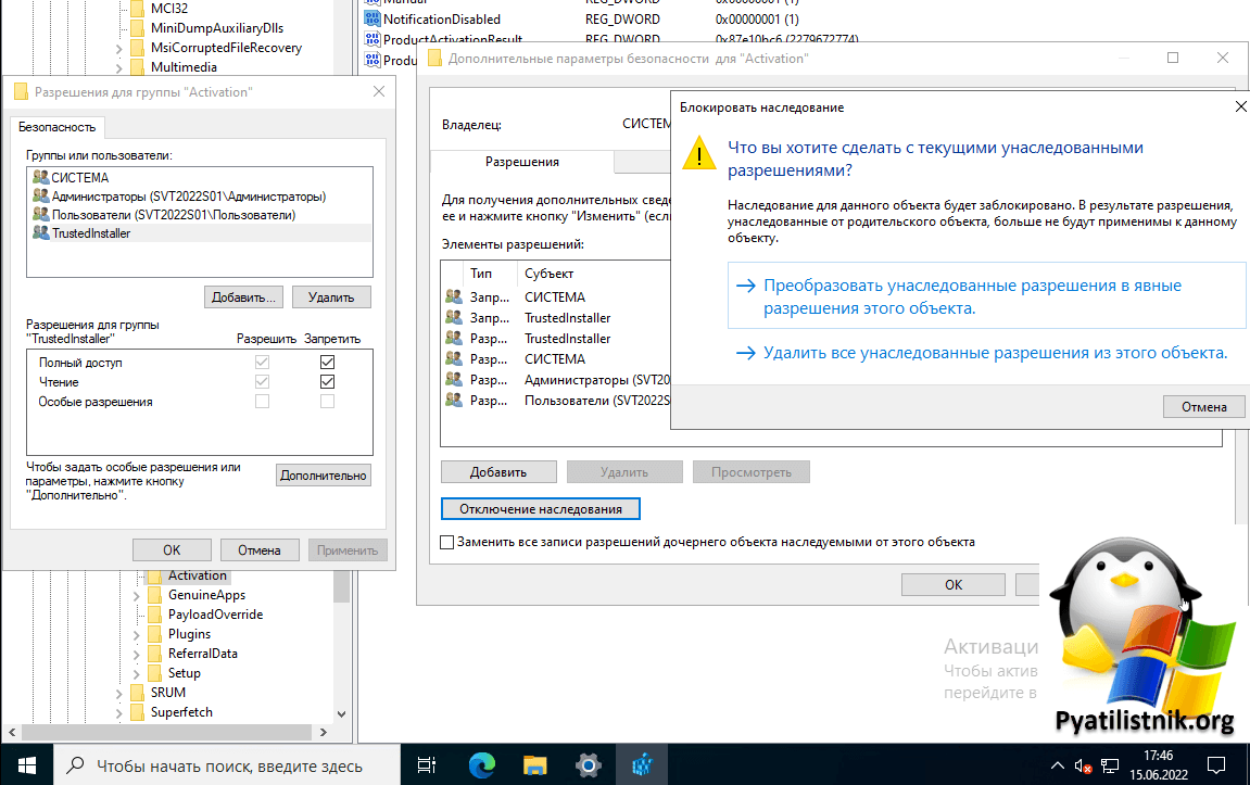 Остается еще только отключить наследование, для этого нажмите на кнопку «Дополнительно» и нажмите на соответствующий пункт «Отключение наследования». Подтвердите преобразование унаследованные разрешения в явные разрешения этого объекта.