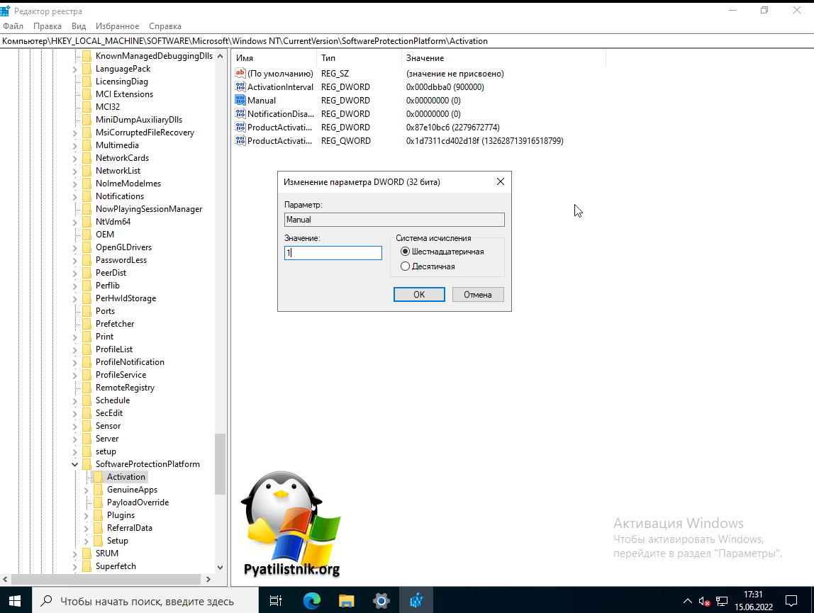 Найдите ключ Manual он по умолчанию будет иметь значение «0». Щелкаем по нему два раза и в открывшемся окне измените значение на «1». Единица будет означать скрывать надпись активация Windows.