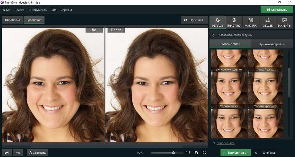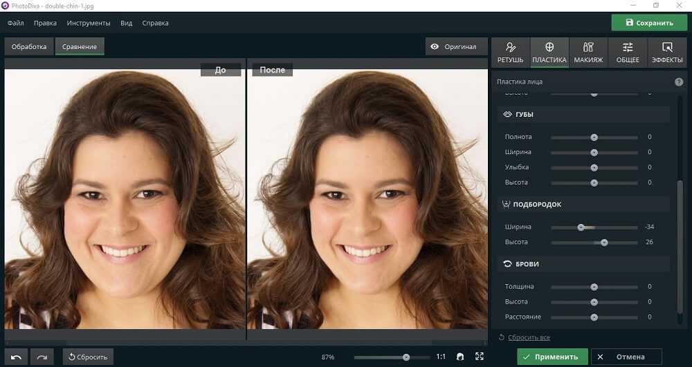 Удаление второго подбородка на фото – достаточно сложная ретушь, которая имеется не во всех редакторах фото. Если вы хотите сделать это онлайн, то не сможете найти сервис, который предлагает пользователям такую функцию. Чтобы убрать подбородок в фотошопе, требует много времени и знаний этого редактора. Поэтому лучше отдать предпочтение программе PhotoDiva. Там эта операция отнимает буквально несколько минут. Дополнительно вы можете быстро украсить портрет: убрать прыщи на фото, наложить макияж, применить авторетушь, убрать «красные глаза». Скачайте PhotoDiva и с легкостью избавляйтесь даже от серьезных дефектов на вашем селфи.