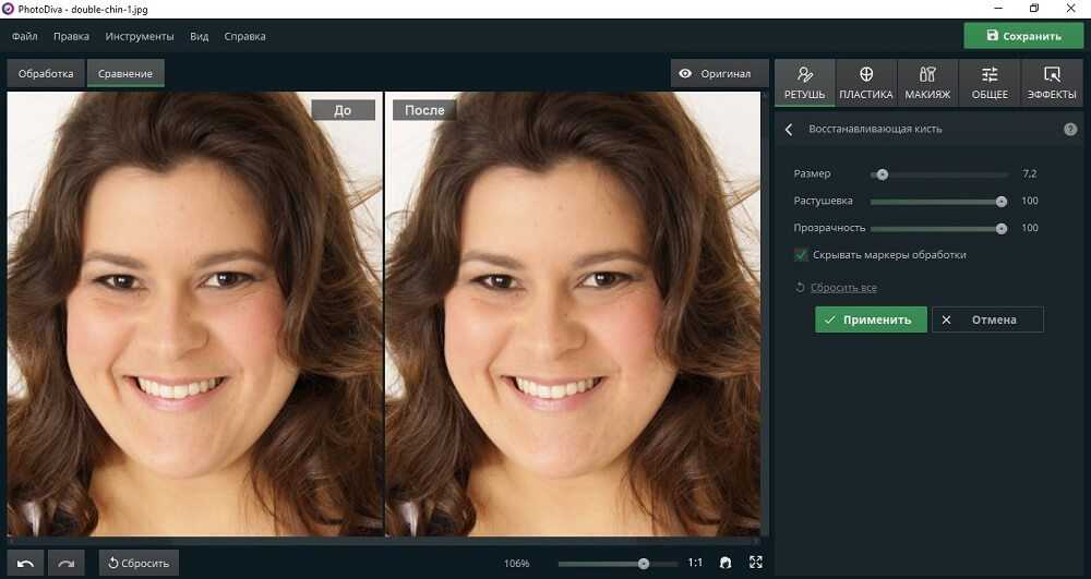 Для начала нужно избавиться от складок двойного подбородка. В разделе «Ретушь» найдите опцию «Восстанавливающая кисть». Отрегулируйте размер инструмента и аккуратно удалите лишнее с фото.