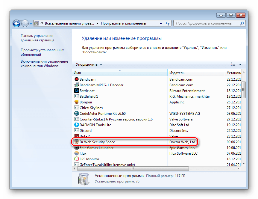 В операционной системе Windows присутствует встроенное средство по полному удалению программ с компьютера. С его помощью также осуществляется и деинсталляция Dr.Web. Выполнить данный процесс можно следующим образом: