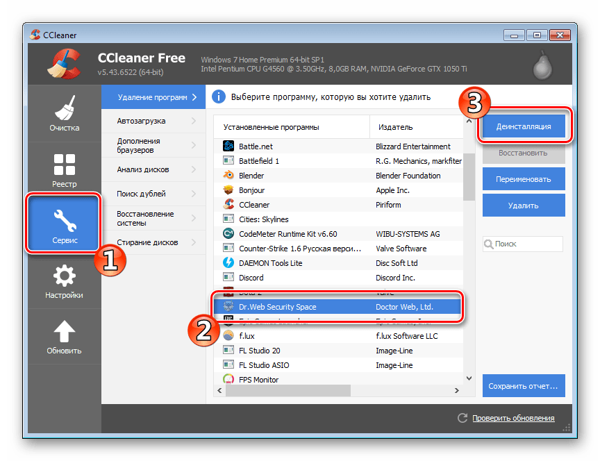 Существует такая многофункциональная программа как CCleaner. Основным ее предназначением является очищение компьютера от лишнего мусора, исправление ошибок и управление автозагрузкой. Однако это еще не все ее возможности. С помощью данного софта также производится деинсталляция любого установленного на компьютере ПО. Процесс удаления Dr.Web выглядит следующим образом: