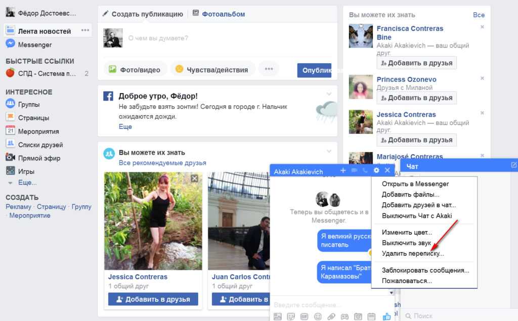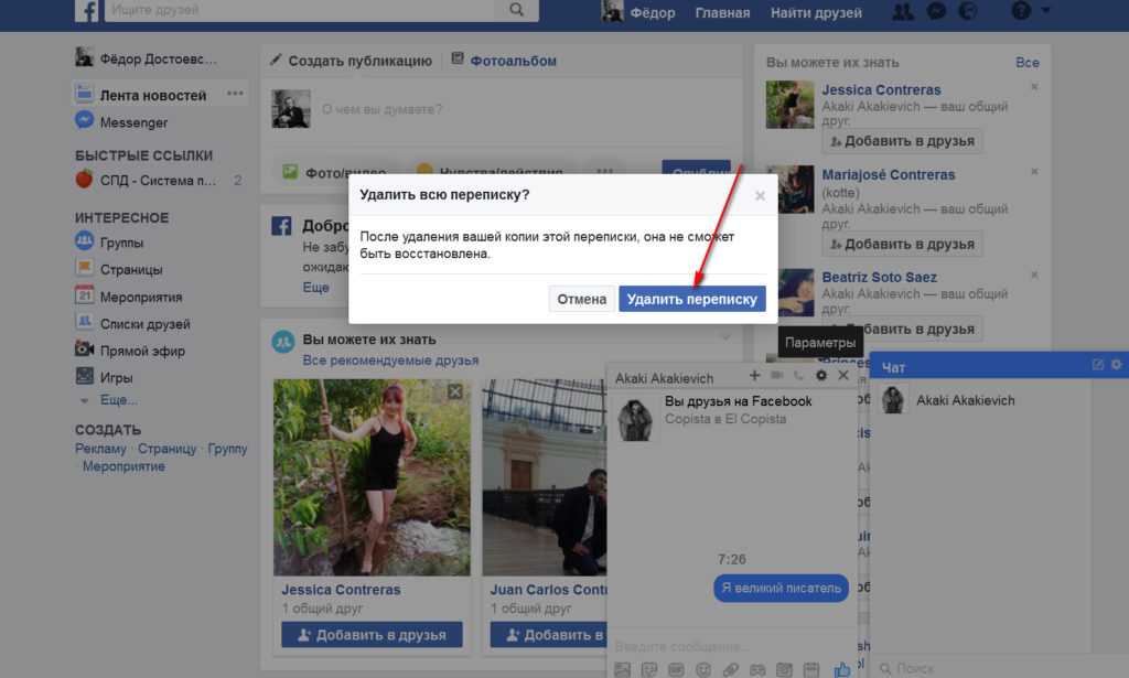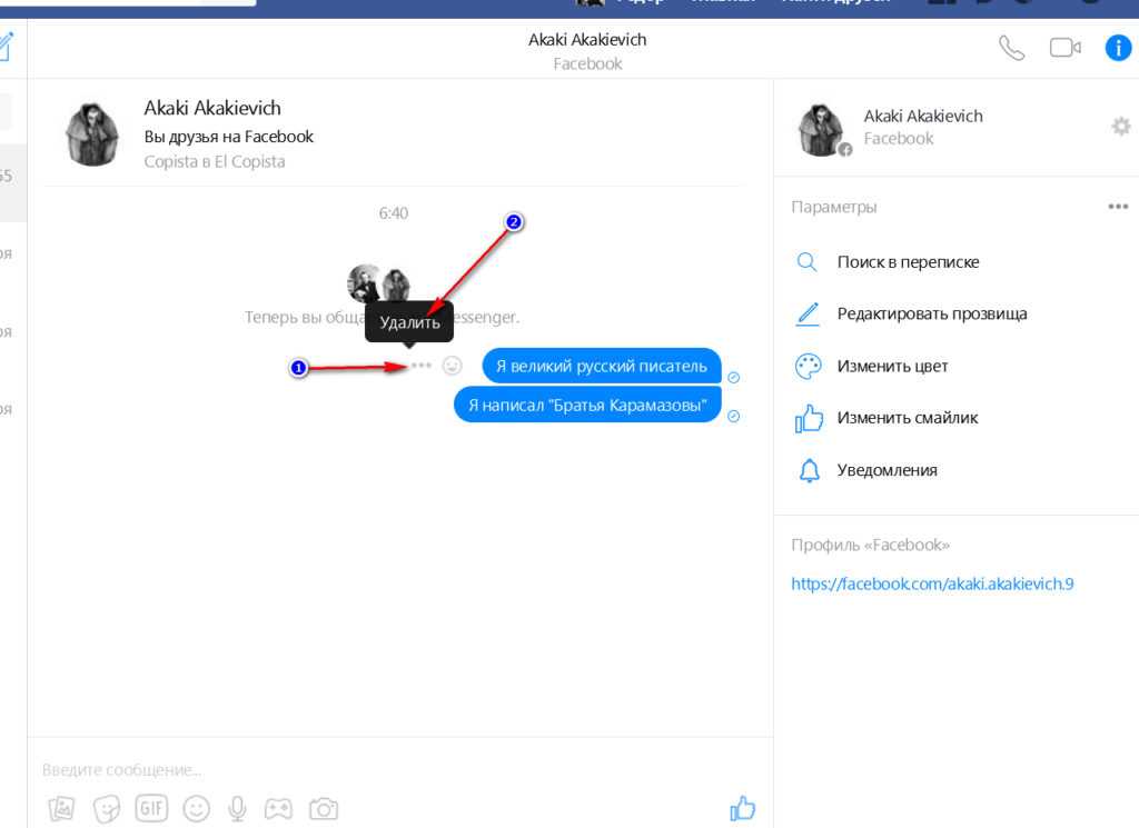 Таки образом, вы удалите любое сообщения, какое хотите. Но если вы желаете удалить всю переписку на «Facebook» из архива истории, тогда повторите два первых действия, описанных в данной инструкции и далее нажмите на пункт «Удалить переписку» в открывшемся меню.