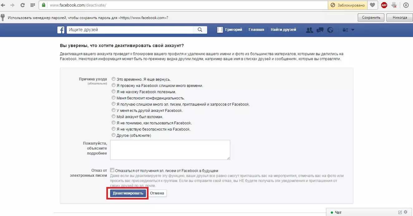 Попадаем в меню, где нужно выбрать причину деактивации и что-то написать в поле «Пожалуйста, объясните подробнее». После заполнения поля нужно нажать на кнопку «Деактивировать».