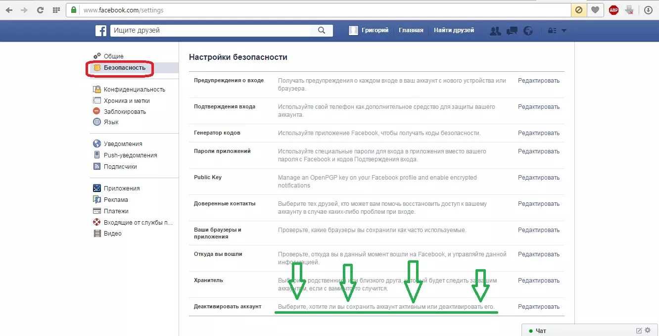 В меню справа выбираем пункт «Безопасность» (обведен красным цветом на рисунке ниже). После этого видим надпись «Деактивировать аккаунт» и рядом с ней слова «Выберете, хотите…». На эти слова нужно нажать (они подчеркнуты зеленой линией).