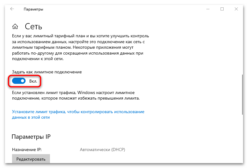 В новом окне в блоке «Лимитное подключение» переведите тумблер в активное состояние у функции «Задать как лимитное подключение».
