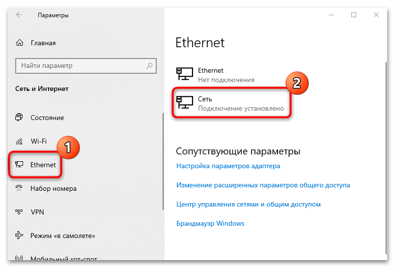 На вкладке слева выберите «Ethernet», затем в центральной части окна – активное подключение.