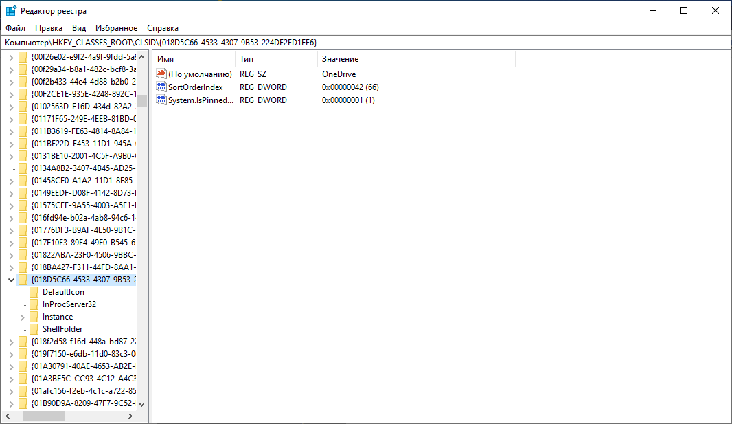 В редакторе реестра переходим по пути HKEY_CLASSES_ROOT\{CLSID018D5C66–4533–4307–9B53–224DE2ED1FE6}. Можно просто ввести его в адресную строку и нажать клавишу «Ввод» (Enter).