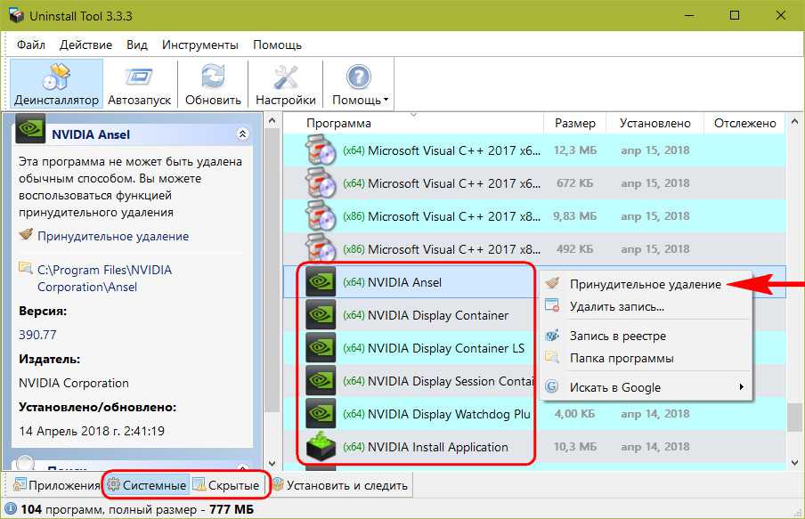 Во-вторых, программа отображает не только основной каталог со сторонним софтом, у неё также есть два отдельных каталога со скрытыми и системными компонентами. Там могут прятаться оставшиеся компоненты сторонних драйверов, а Uninstall Tool умеет их принудительно удалять.