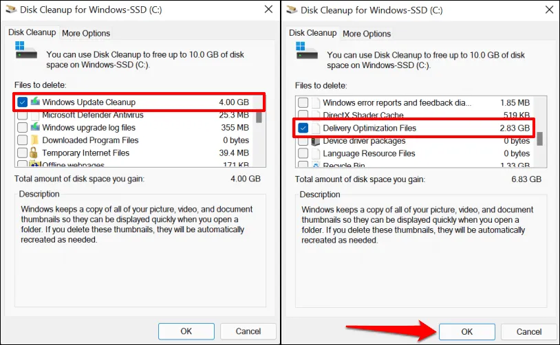 - Установите флажки Windows Update Cleanup и Delivery Optimization Files и нажмите OK.