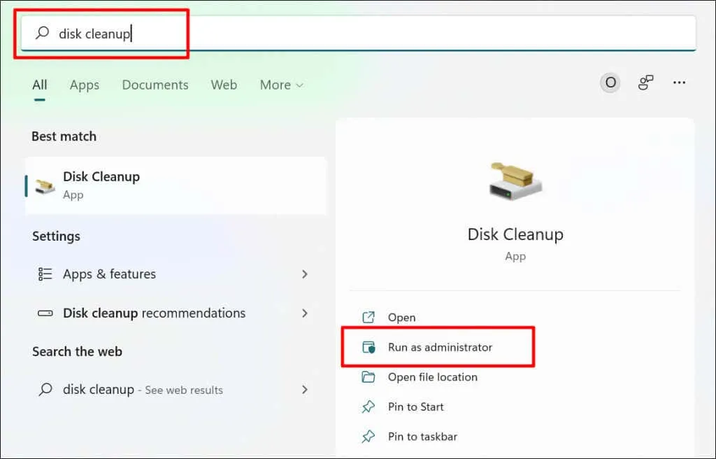 - Нажмите кнопку «Пуск», введите «Очистка диска» в строке поиска и выберите «Запуск от имени администратора» в разделе «Очистка диска».