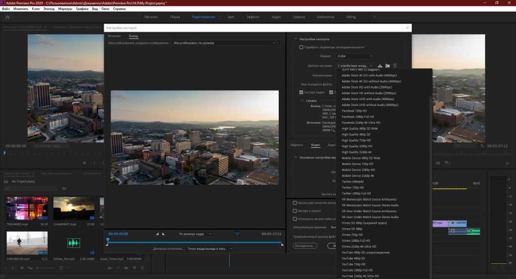 Если не знаете, какие параметры выбирать, укажите формат H.264. Он подойдёт для большинства случаев. Затем выберите один из шаблонов Adobe. Например, в списке есть готовые настройки для YouTube и других популярных сервисов.
