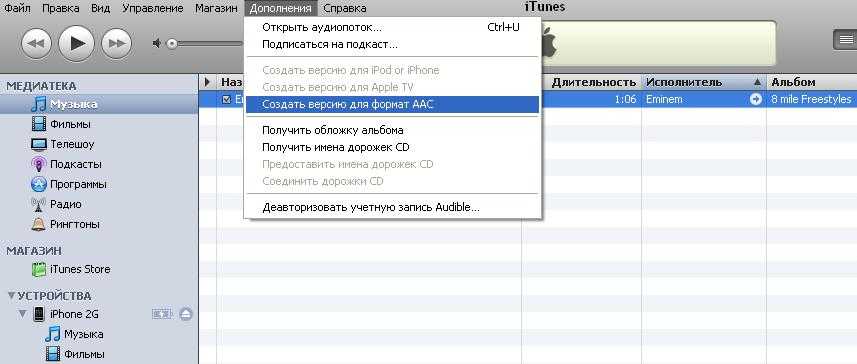 - в верхнем меню iTunes выберите: Файл > Конвертировать > Создать версию в ААС. Рядом с оригиналом появится аналогичный файл – более короткая композиция в формате AAC.