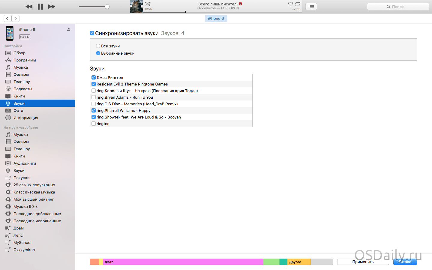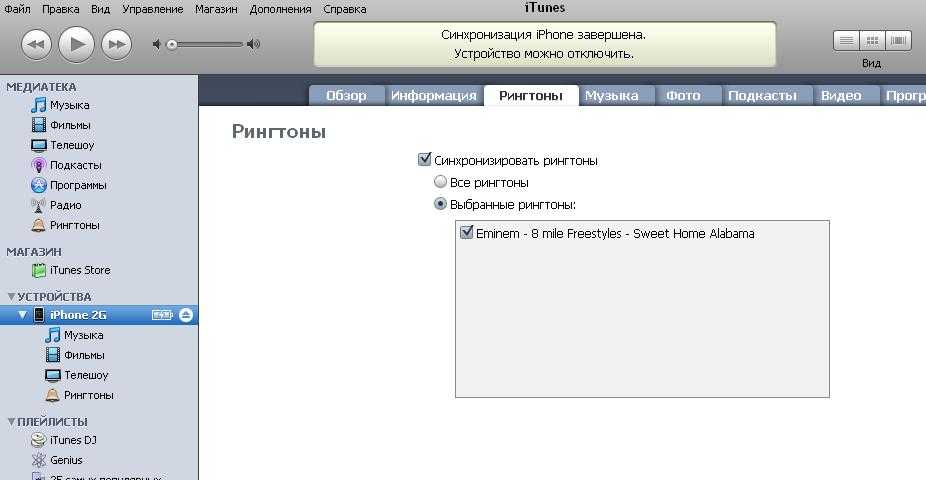 Отметьте выбранный рингтон и поставьте галочку в пункте «Синхронизировать звуки». Выберите, все ли файлы нужно синхронизировать, или только выбранные.