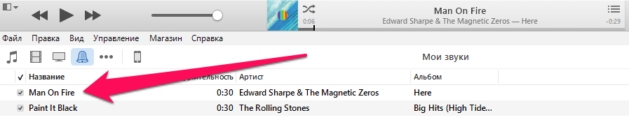 1. Отрываем iTunes. В верхнем левом углу выбираем закладку «Музыка». Из списка песен, выбираем ту, с которой хотим сделать рингтон.