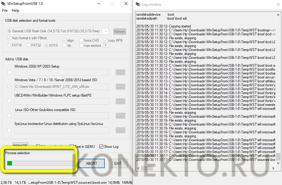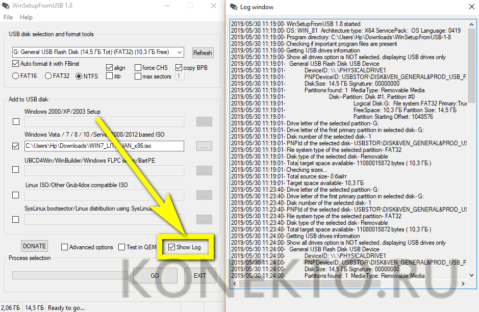 Установить галочку в чекбоксе Show Log — это позволит наблюдать за ходом записи флешки с Виндовс 7 в деталях, убеждаясь, что каждый шаг пройден правильно.