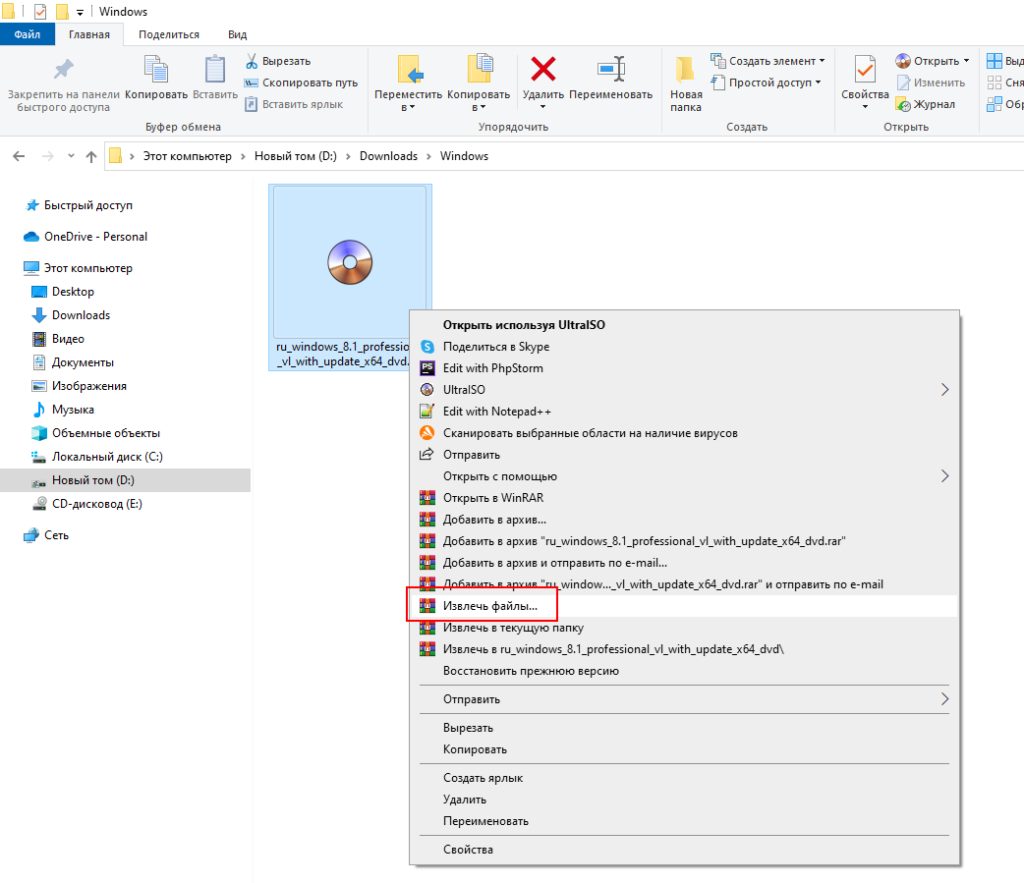 После скачивания образа Восьмерки, мы должны найти его на ПК. Для извлечения файлов (например, с помощью WinRAR), нажмите правой кнопкой мыши на образ с расширением .iso и выберите в появившемся меню пункт «Извлечь файлы».