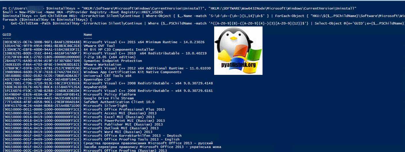 $UninstallKeys = «HKLM:SoftwareMicrosoftWindowsCurrentVersionUninstall», «HKLM:SOFTWAREWow6432NodeMicrosoftWindowsCurrentVersionUninstall» $null = New-PSDrive -Name HKA -PSProvider Registry -Root Registry::HKEY_USERS $UninstallKeys += Get-ChildItem HKU: -ErrorAction SilentlyContinue | Where-Object { $_.Name -match ‘S-d-d+-(d+-){1,14}d+$’ } | ForEach-Object { «HKU:$($_.PSChildName)SoftwareMicrosoftWindowsCurrentVersionUninstall» } foreach ($UninstallKey in $UninstallKeys) { Get-ChildItem -Path $UninstallKey -ErrorAction SilentlyContinue | Where {$_.PSChildName -match ‘^{{8}-({4}-){3}{12}}$’} | Select-Object @{n=’GUID’;e={$_.PSChildName}}, @{n=’Name’; e={$_.GetValue(‘DisplayName’)}} }