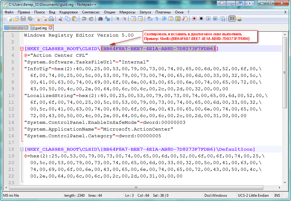 Выделяем значение, с помощью клавиш Ctrl + C копируем, вызываем диалоговое окно «Выполнить» и с помощью клавиш Ctrl + V вставляем, перед фигурными скобками прописываем Shell::: и нажимаем«OK».