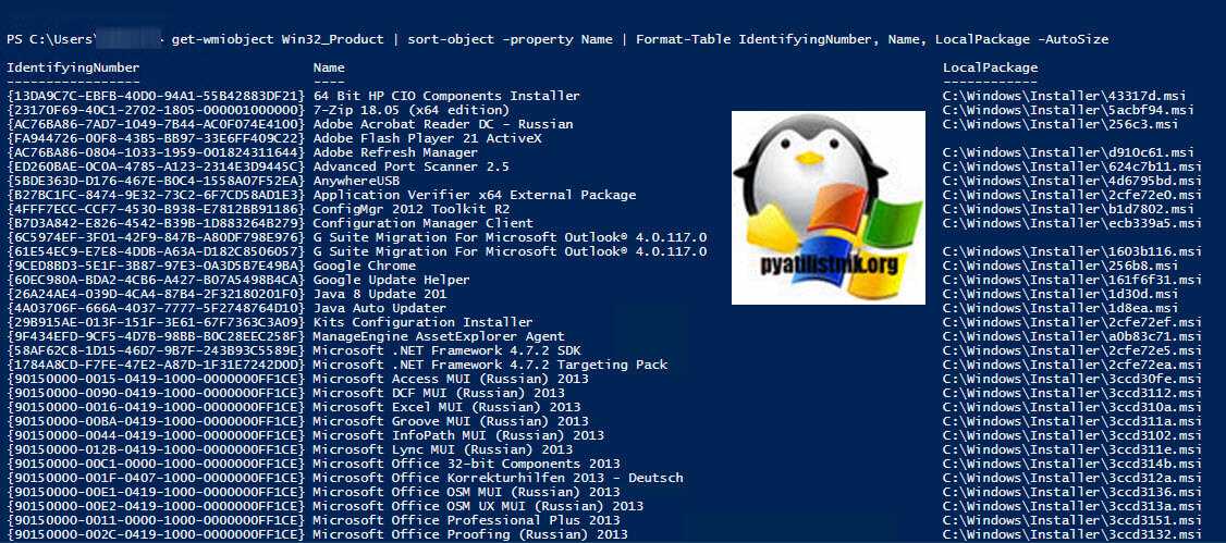 get—wmiobject Win32_Product | sort—object —property Name | Format—Table IdentifyingNumber, Name, LocalPackage —AutoSize