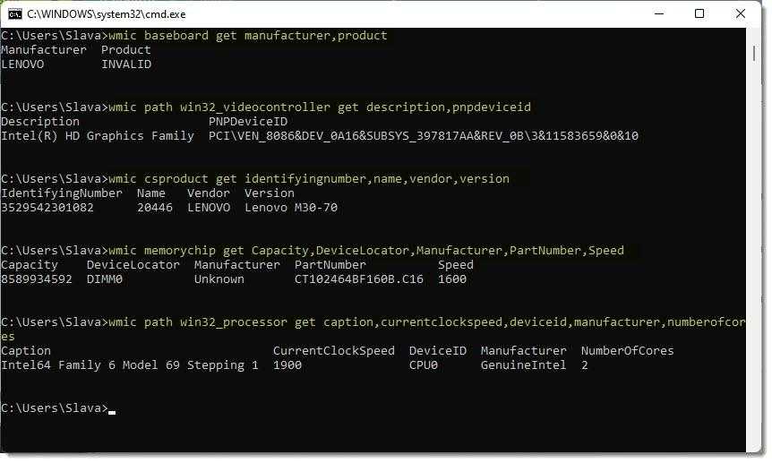 В «Командной строке» можно запускать такие команды, для получения данных: