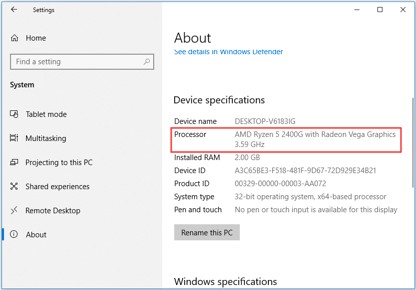 Вы можете нажать Пуск -> Настройки -> Система -> О программе и проверить имя и скорость вашего процессора ЦП в разделе Характеристики устройства .