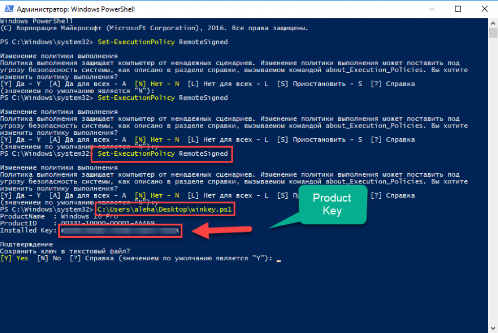 В результате выполнения команды вы увидите информацию о ключе установленной Windows 10 (в пункте Installed Key) и предложение сохранить ее в текстовый файл. После того, как вы узнали ключ продукта, можете вернуть политику выполнения скриптов в PowerShell к значению по умолчанию с помощью команды Set-ExecutionPolicy restricted