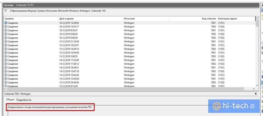Далее вы увидите отсортированные сведения по коду событий остановки и запуску службы журнала.
