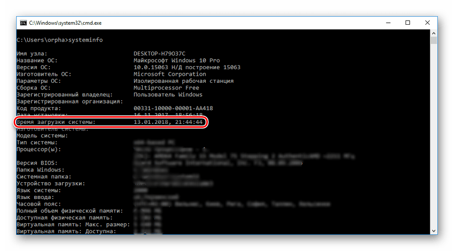 - Кликните по этой строке и наберите команду systeminfo. Перед вами появится список с информацией. С левой стороны списка найдите строку «Время работы системы». Рядом с этой строкой будет информация о том, сколько часов, дней, минут и секунд работал ПК. Ну, а вам нужно только сопоставить время вашего отсутствия и указанного рабочего времени в компьютере, чтобы вычислить, сколько работал ПК, и включали ли его в вашем отсутствии.