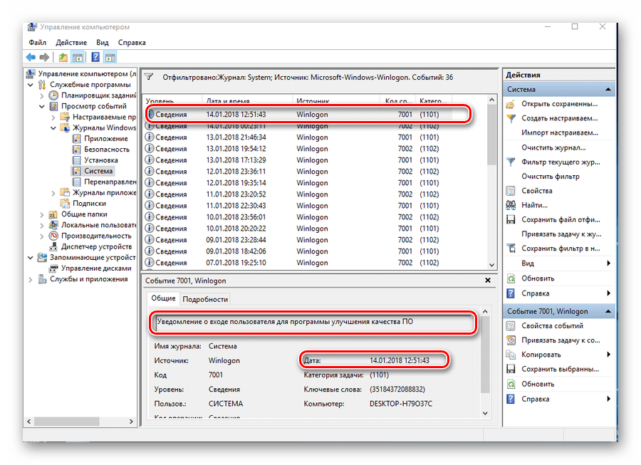 Именно здесь вы сможете посмотреть нужную вам информацию. По центру открывшегося окна отобразится таблица log — в ней записываются все события, происходящие и происходившие с вашим компьютером. У каждого события, происходящего в ПК, есть своё время и свой код. Но это в принципе на данный момент не нужно, если вы зашли туда только для того, чтобы узнать посещал ли кто ваш компьютер. А вам же нужно просто просмотреть таблицу и увидеть время пользования. Там всё чётко видно, когда включали ПК и когда его выключали.