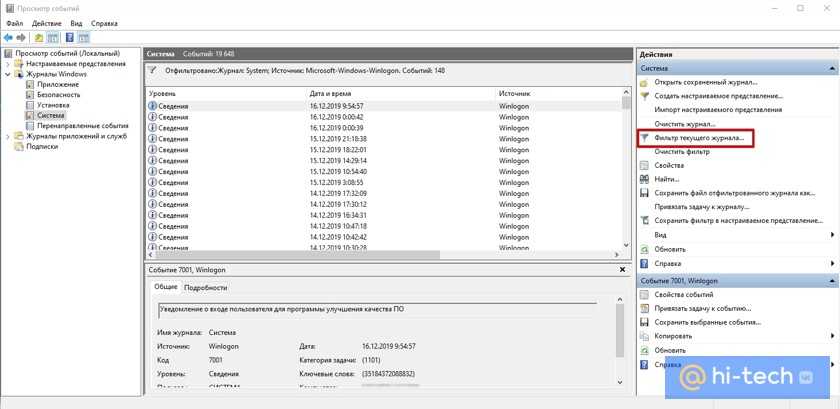 Теперь нужно оставить только те события, которые нас интересуют. Для этого кликните правой кнопкой мыши на пункте «Система» и выберите «Фильтр текущего журнала» или же найдите фильтр на панели в правой части окна программы.