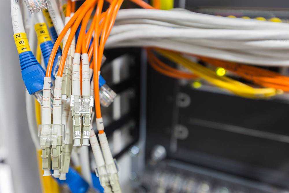 Тонкие оранжевые кабели — «оптика», серые на заднем плане — витая пара. Фото: basiczto / Shutterstock