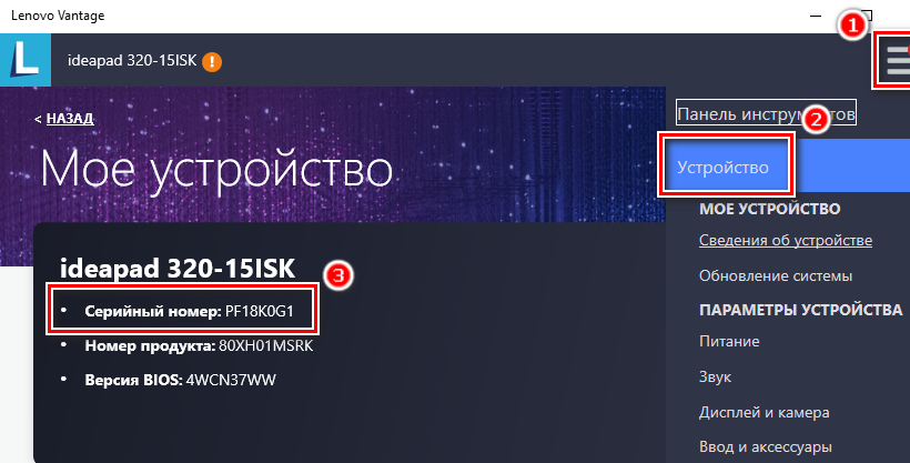 В случае с Lenovo фирменная утилита — это «Lenovo Vintage». Чтобы посмотреть серийный номер, запустите утилиту и перейдите на вкладку «Устройство». В верхней части расположен блок, где отобразится модель, версия BIOS, а также серийный номер.