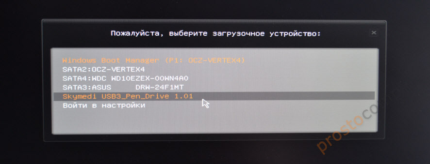 Второй способ поддерживают почти все современные компьютеры и ноутбуки. Нужно при старте компьютера вызвать меню выбора загрузочного устройства. Так можно единоразово выбрать с чего грузиться, это очень удобно.